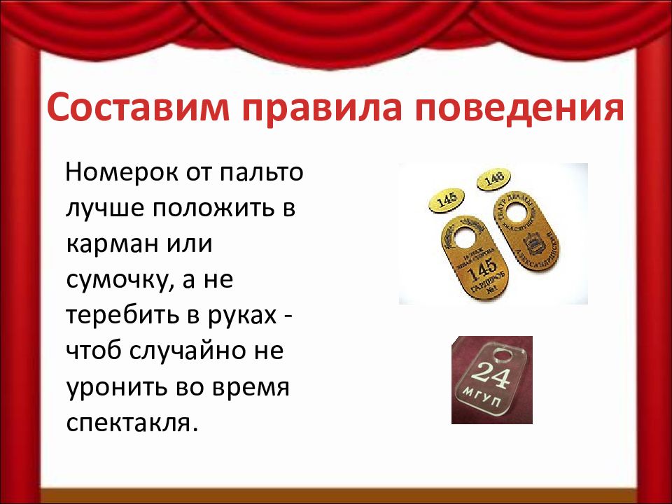 Номерок от пальто лучше положить в карман или сумочку, а не теребить в руках - чтоб случайно не уронить во время спектакля.