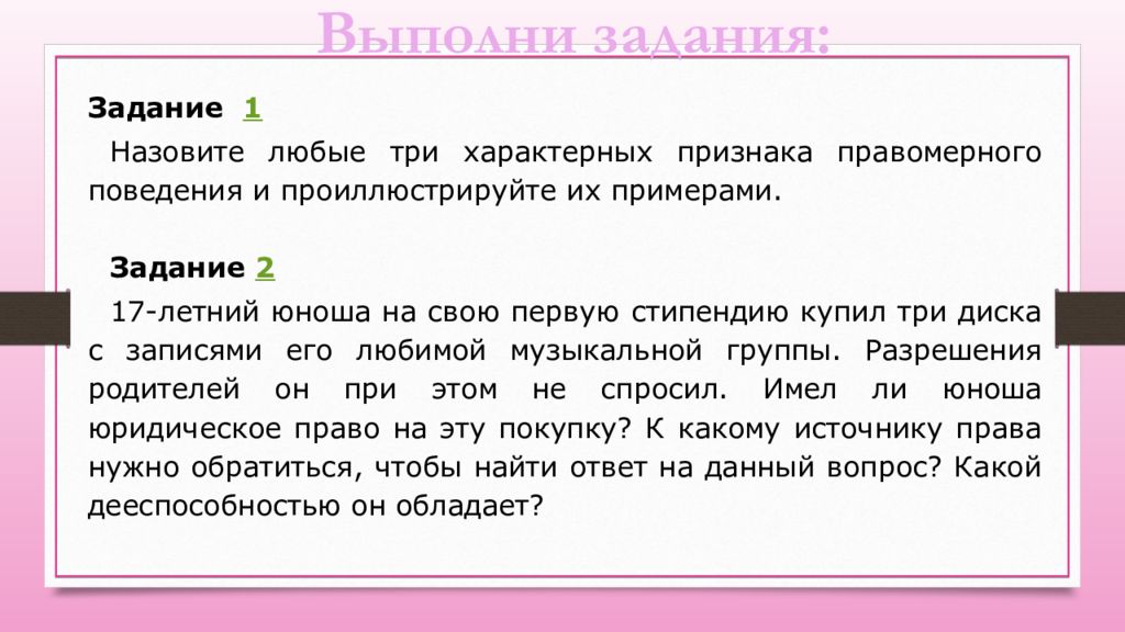Задание 1 Назовите любые три характерных признака правомерного поведения и проиллюстрируйте их примерами. Задание 2 17-летний юноша на свою первую стипендию купил три диска с записями его любимой музыкальной группы. Разрешения родителей он при этом не спросил. Имел ли юноша юридическое право на эту покупку? К какому источнику права нужно обратиться, чтобы найти ответ на данный вопрос? Какой дееспособностью он обладает? Выполни задания: