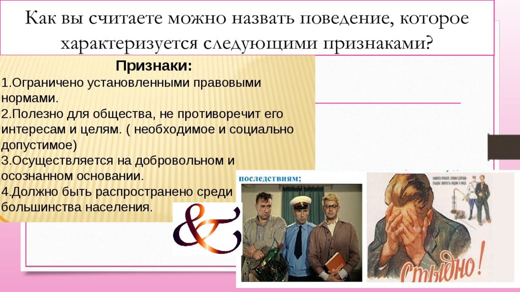 Первый слайд презентации: Как вы считаете можно назвать поведение, которое характеризуется следующими признаками?