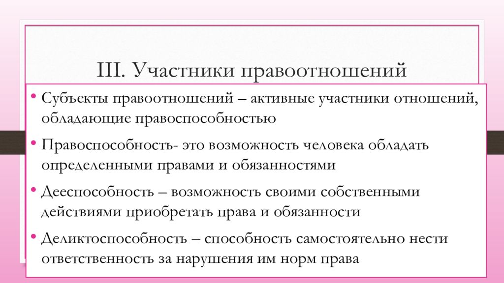 Субъекты правоотношений – активные участники отношений, обладающие правоспособностью Правоспособность- это возможность человека обладать определенными правами и обязанностями Дееспособность – возможность своими собственными действиями приобретать права и обязанности Деликтоспособность – способность самостоятельно нести ответственность за нарушения им норм права