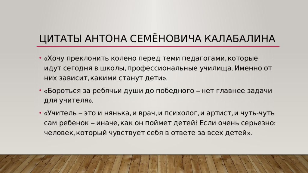 «Хочу преклонить колено перед теми педагогами, которые идут сегодня в школы, профессиональные училища. Именно от них зависит, какими станут дети». «Бороться за ребячьи души до победного – нет главнее задачи для учителя». «Учитель – это и нянька, и врач, и психолог, и артист, и чуть-чуть сам ребенок – иначе, как он поймет детей? Если очень серьезно: человек, который чувствует себя в ответе за всех детей». Цитаты Антона Семёновича Калабалина