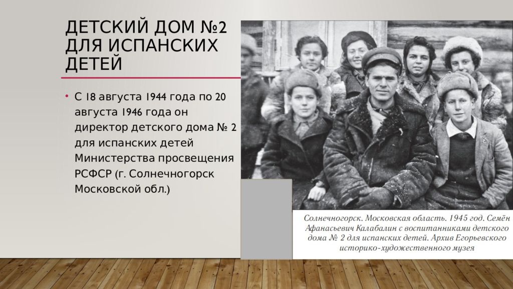 С 18 августа 1944 года по 20 августа 1946 года он директор детского дома № 2 для испанских детей Министерства просвещения РСФСР (г. Солнечногорск Московской обл.)