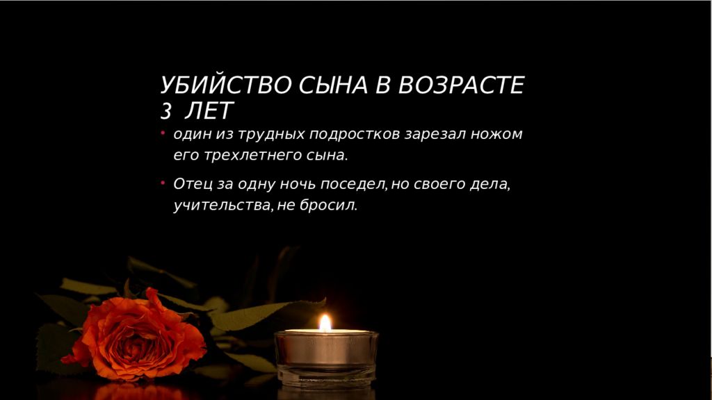 один из трудных подростков зарезал ножом его трехлетнего сына. Отец за одну ночь поседел, но своего дела, учительства, не бросил. Убийство сына в возрасте 3 лет
