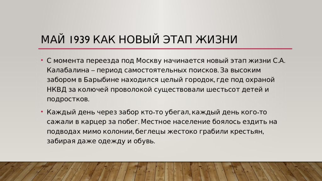 С момента переезда под Москву начинается новый этап жизни С.А. Калабалина – период самостоятельных поисков. За высоким забором в Барыбине находился целый городок, где под охраной НКВД за колючей проволокой существовали шестьсот детей и подростков. Каждый день через забор кто-то убегал, каждый день кого-то сажали в карцер за побег. Местное население боялось ездить на подводах мимо колонии, беглецы жестоко грабили крестьян, забирая даже одежду и обувь.