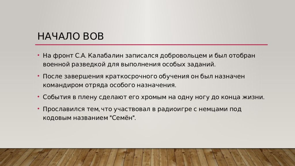 На фронт С.А. Калабалин записался добровольцем и был отобран военной разведкой для выполнения особых заданий. После завершения краткосрочного обучения он был назначен командиром отряда особого назначения. События в плену сделают его хромым на одну ногу до конца жизни. Прославился тем, что участвовал в радиоигре с немцами под кодовым названием "Семён".