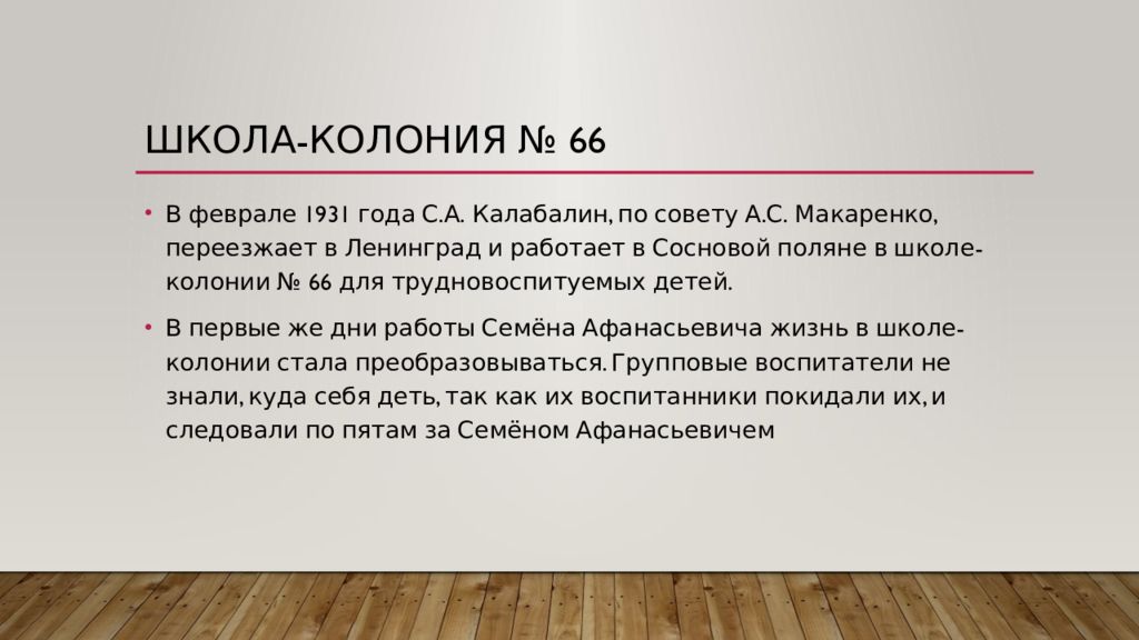 В феврале 1931 года С.А. Калабалин, по совету А.С. Макаренко, переезжает в Ленинград и работает в Сосновой поляне в школе-колонии № 66 для трудновоспитуемых детей. В первые же дни работы Семёна Афанасьевича жизнь в школе-колонии стала преобразовываться. Групповые воспитатели не знали, куда себя деть, так как их воспитанники покидали их, и следовали по пятам за Семёном Афанасьевичем