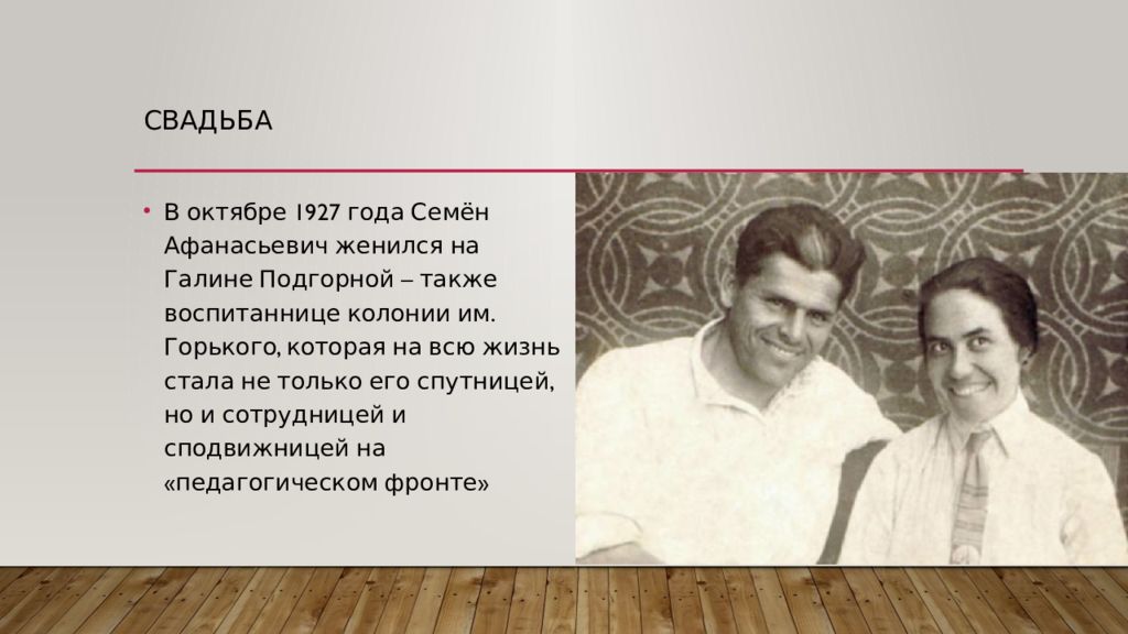 В октябре 1927 года Семён Афанасьевич женился на Галине Подгорной – также воспитаннице колонии им. Горького, которая на всю жизнь стала не только его спутницей, но и сотрудницей и сподвижницей на «педагогическом фронте»