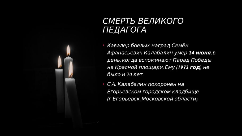 Кавалер боевых наград Семён Афанасьевич Калабалин умер 24 июня, в день, когда вспоминают Парад Победы на Красной площади. Ему ( 1972 год ) не было и 70 лет. С.А. Калабалин похоронен на Егорьевском городском кладбище (г Егорьевск, Московской области ).