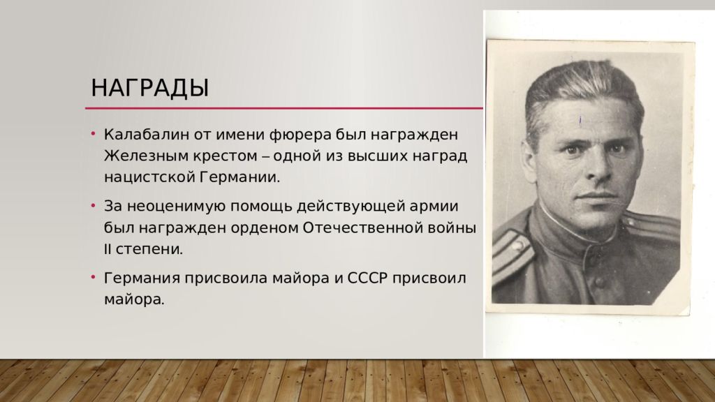 Калабалин от имени фюрера был награжден Железным крестом – одной из высших наград нацистской Германии. З а неоценимую помощь действующей армии был награжден орденом Отечественной войны II степени. Германия присвоила майора и СССР присвоил майора.
