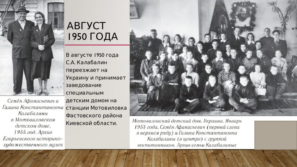 В августе 1950 года С.А. Калабалин переезжает на Украину и принимает заведование специальным детским домом на станции Мотовиловка Фастовского района Киевской области.