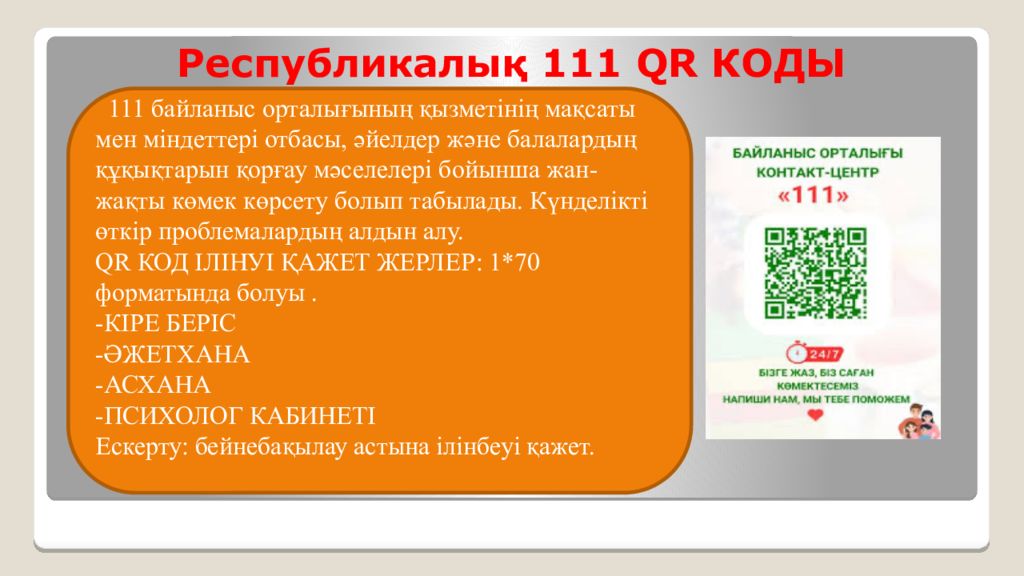 111 байланыс орталығының қызметінің мақсаты мен міндеттері отбасы, әйелдер және балалардың құқықтарын қорғау мәселелері бойынша жан-жақты көмек көрсету болып табылады. Күнделікті өткір проблемалардың алдын алу. QR КОД ІЛІНУІ ҚАЖЕТ ЖЕРЛЕР: 1*70 форматында болуы. -КІРЕ БЕРІС -ӘЖЕТХАНА -АСХАНА -ПСИХОЛОГ КАБИНЕТІ Ескерту: бейнебақылау астына ілінбеуі қажет.