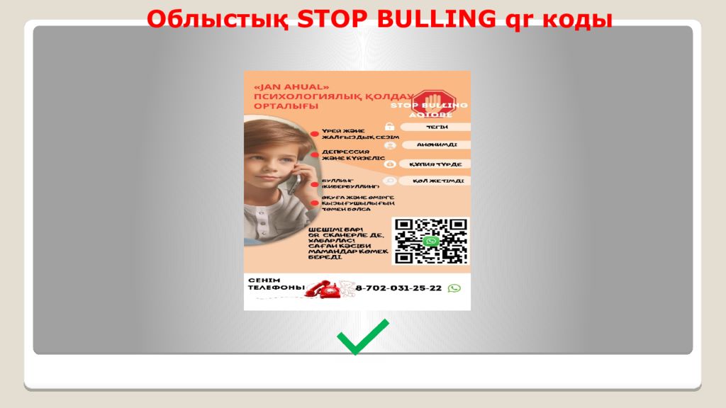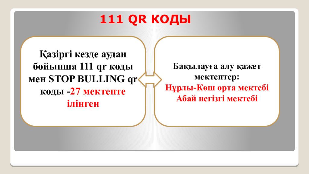 Қазіргі кезде аудан бойынша 111 qr коды мен STOP BULLING qr коды - 27 мектепте ілінген Бақылауға алу қажет мектептер: Нұрлы-Көш орта мектебі Абай негізгі мектебі