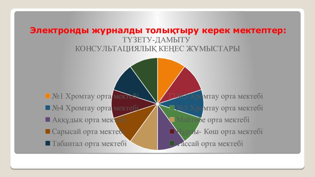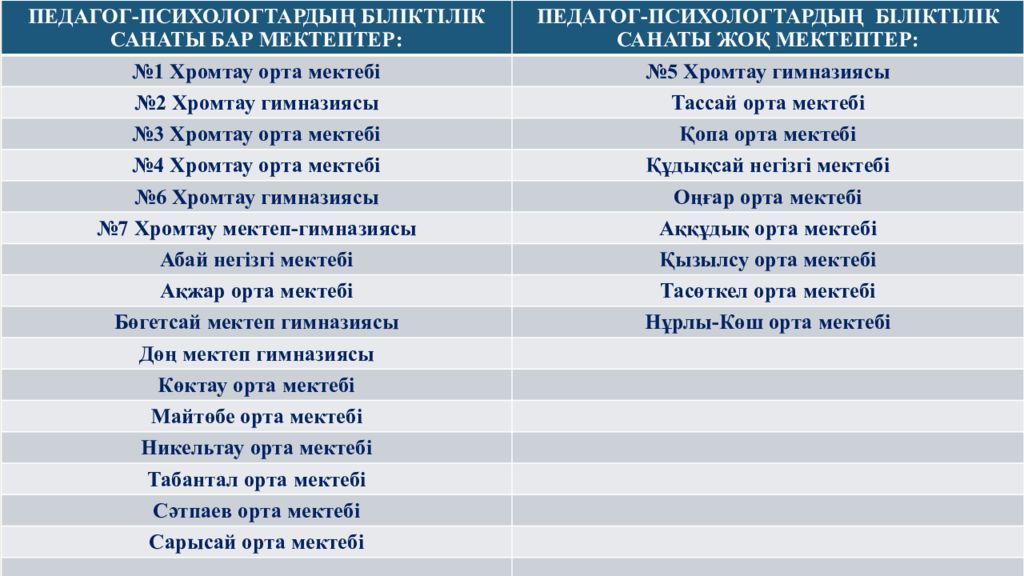 ПЕДАГОГ-ПСИХОЛОГТАРДЫҢ БІЛІКТІЛІК САНАТЫ БАР МЕКТЕПТЕР: ПЕДАГОГ-ПСИХОЛОГТАРДЫҢ БІЛІКТІЛІК САНАТЫ ЖОҚ МЕКТЕПТЕР: №1 Хромтау орта мектебі №5 Хромтау гимназиясы №2 Хромтау гимназиясы Тассай орта мектебі №3 Хромтау орта мектеб і Қопа орта мектебі №4 Хромтау орта мекте бі Құдықсай негізгі мектебі №6 Хромтау гимназиясы Оңғар орта мектебі №7 Хромтау мектеп-гимназиясы Аққұдық орта мектебі Абай нег ізгі мектебі Қызылсу орта мектебі Ақжар орта мектебі Тасөткел орта мектебі Бөгетсай мектеп гимназиясы Нұрлы-Көш орта мектебі Дөң мектеп гимназиясы Көктау орта мектебі Майтөбе орта мектебі Никельтау орта мектебі Табантал орта мектебі Сәтпаев орта мектебі Сарысай орта мектебі