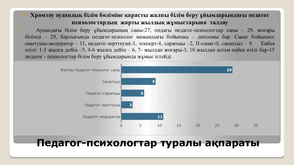Хромтау аудандық білім бөліміне қарасты жалпы білім беру ұйымдарындағы педагог психологтардың жарты жылдық жұмыстарына талдау Аудандағы білім беру ұйымдарының саны-27, ондағы педагог-психологтар саны – 29, жоғары білімді – 29, барлығында педагог-психолог мамандығы бойынша – дипломы бар. Санат бойынша: оқытушы-модератор – 11, педагог-зерттеуші-3, эскперт-4, сарапшы –2, ІІ-санат-0, санатсыз – 9. Еңбек өтілі: 1-3 жылға дейін –5, 4-6 жылға дейін – 6, 7- жылдан жоғары-3, 10 жылдан астам еңбек өтілі бар-15 педагог - психологтар білім беру ұйымдарында жұмыс істейді.