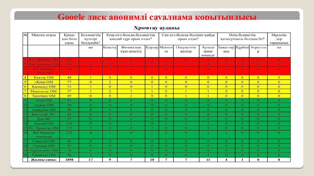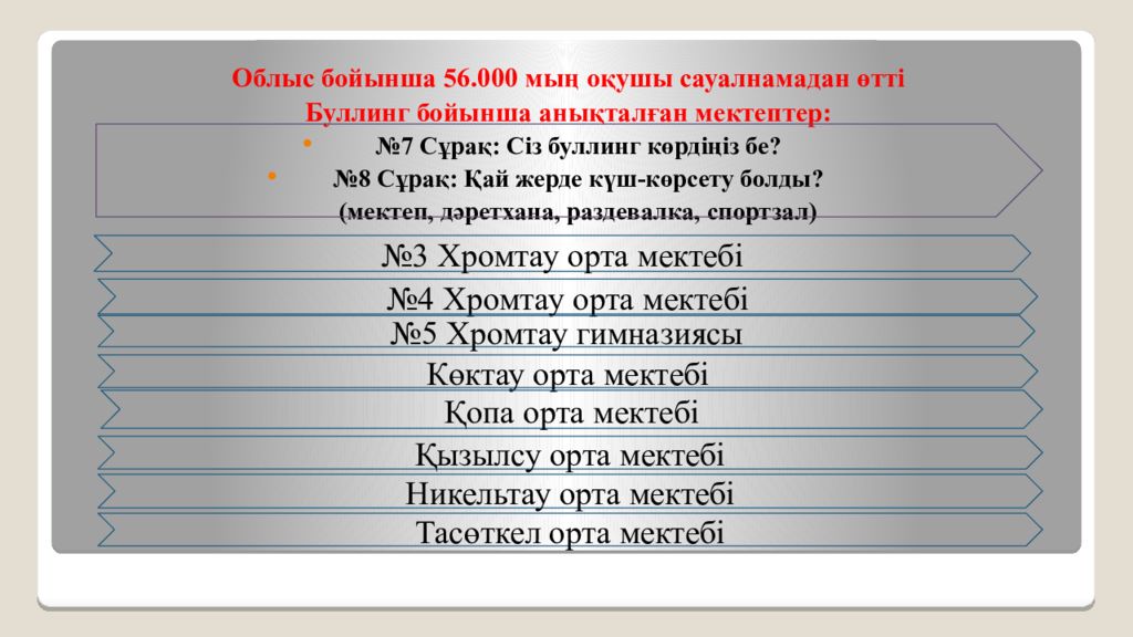 Облыс бойынша 56.000 мың оқушы сауалнамадан өтті Буллинг бойынша анықталған мектептер: №7 С ұрақ: Сіз буллинг көрдіңіз бе ? №8 Сұрақ: Қай жерде күш-көрсету болды? ( мектеп, дәретхана, раздевалка, спортзал) №4 Хромтау орта мектеб і №3 Хромтау орта мектеб і №5 Хромтау гимназиясы Көктау орта мектебі Қопа орта мектебі Қызылсу орта мектебі Никельтау орта мектебі Тас өткел орта мектебі