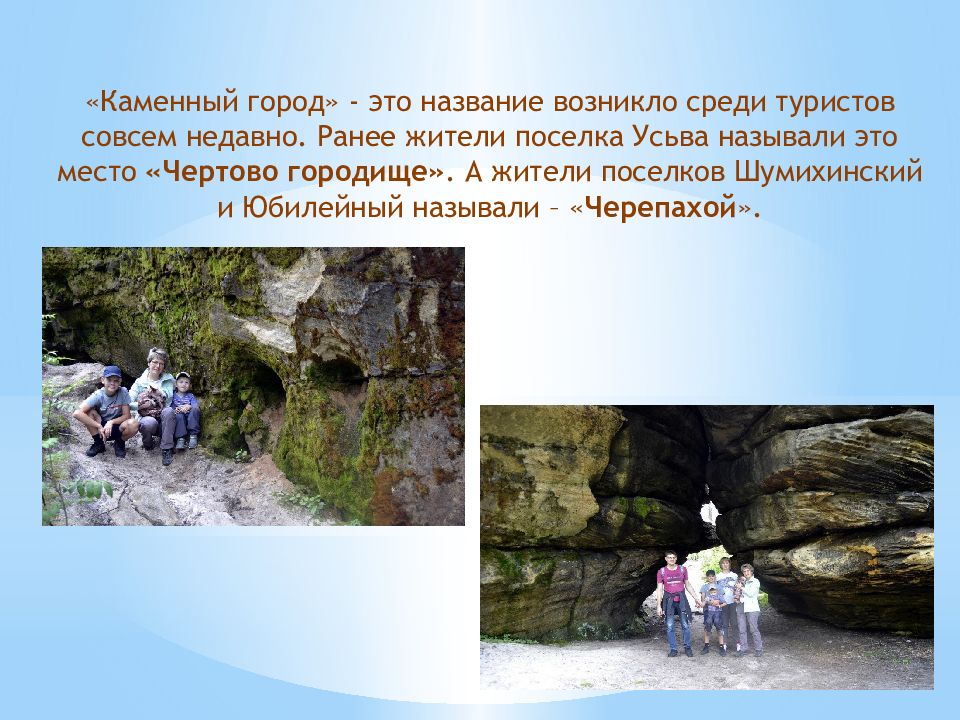 «Каменный город» - это название возникло среди туристов совсем недавно. Ранее жители поселка Усьва называли это место «Чертово городище». А жители поселков Шумихинский и Юбилейный называли – « Черепахой ».
