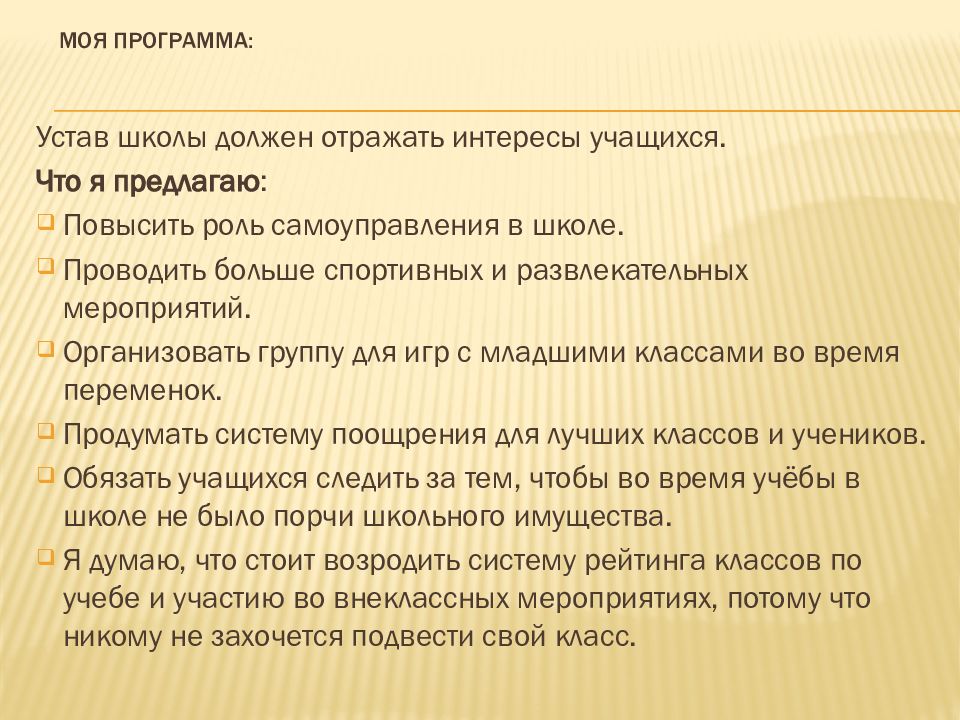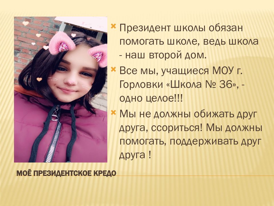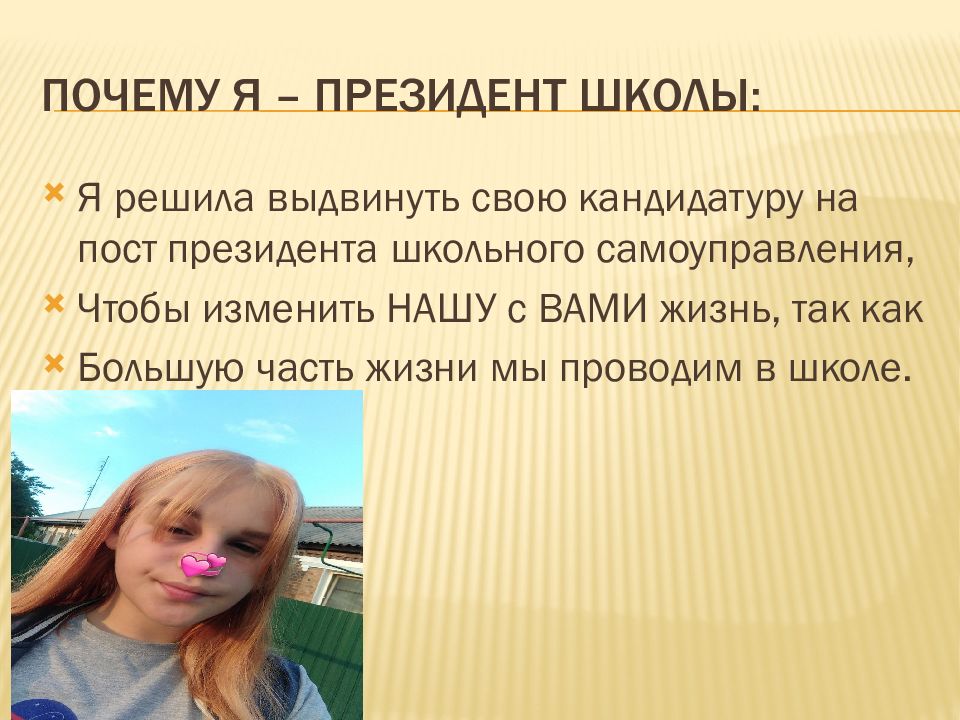 Я решила выдвинуть свою кандидатуру на пост президента школьного самоуправления, Чтобы изменить НАШУ с ВАМИ жизнь, так как Большую часть жизни мы проводим в школе.