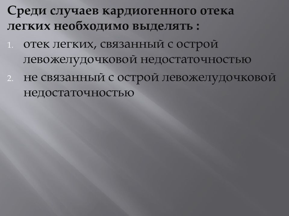Среди случаев кардиогенного отека легких необходимо выделять : отек легких, связанный с острой левожелудочковой недостаточностью не связанный с острой левожелудочковой недостаточностью