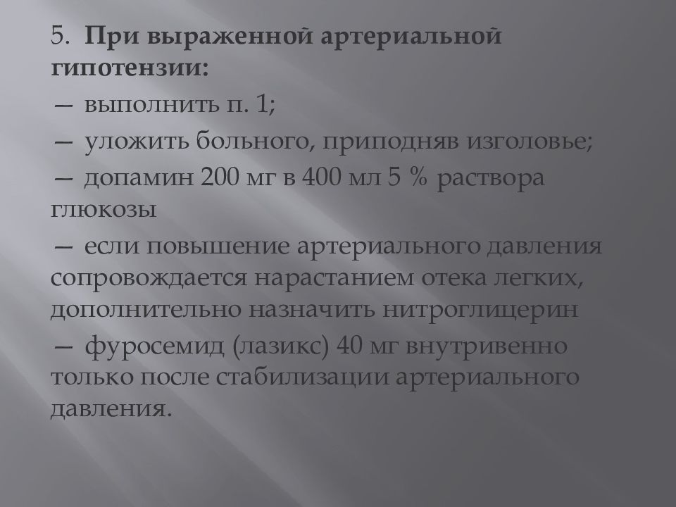 5. При выраженной артериальной гипотензии: — выполнить п. 1; — уложить больного, приподняв изголовье; — допамин 200 мг в 400 мл 5 % раствора глюкозы — если повышение артериального давления сопровождается нарастанием отека легких, дополнительно назначить нитроглицерин — фуросемид (лазикс) 40 мг внутривенно только после стабилизации артериального давления.