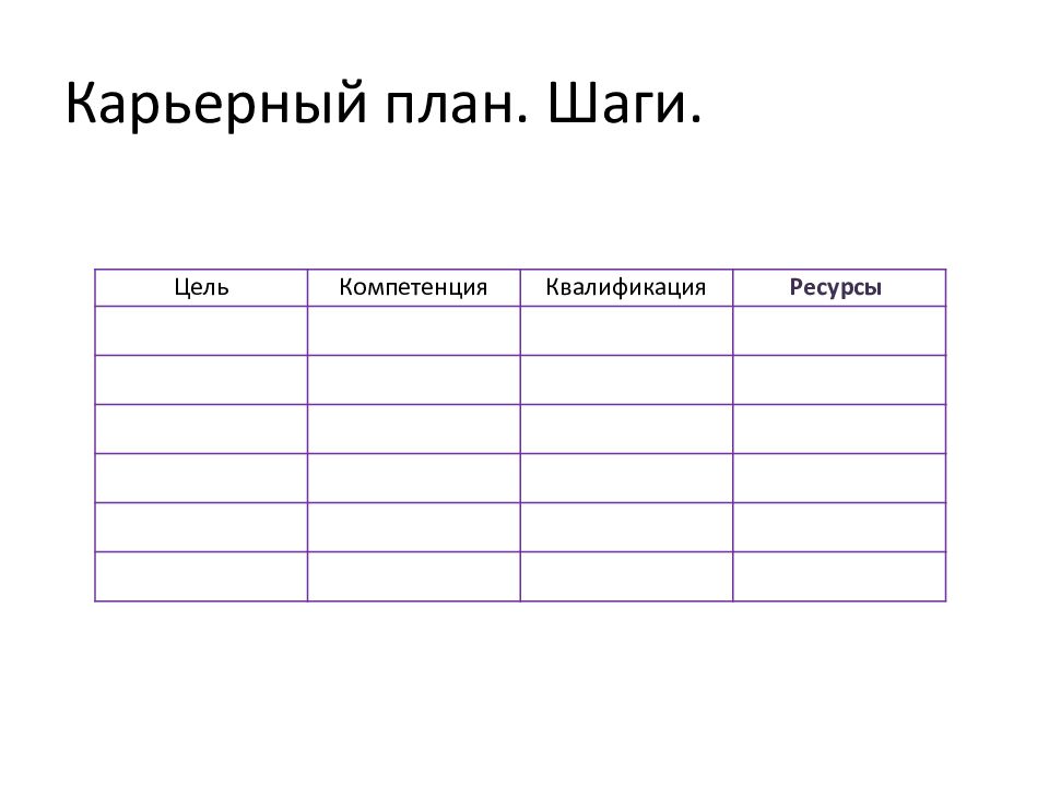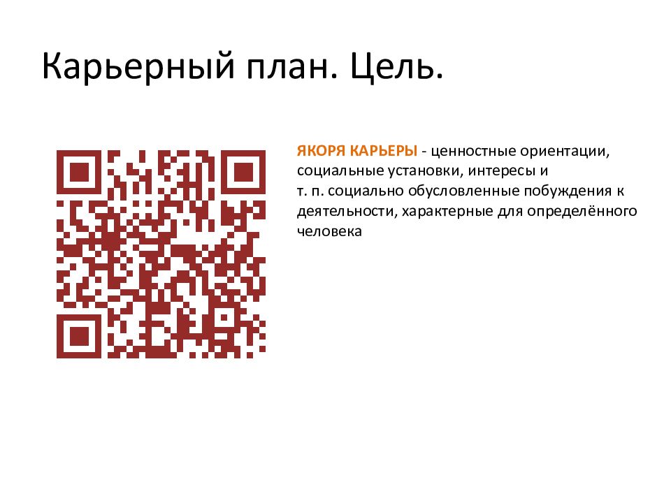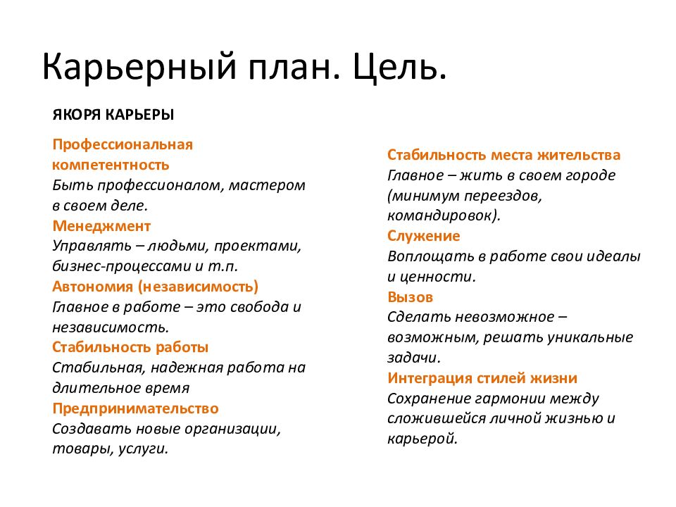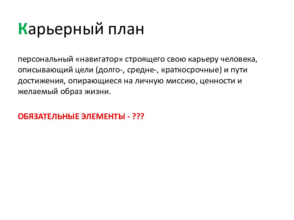 персональный «навигатор» строящего свою карьеру человека, описывающий цели (долго-, средне-, краткосрочные) и пути достижения, опирающиеся на личную миссию, ценности и желаемый образ жизни. ОБЯЗАТЕЛЬНЫЕ ЭЛЕМЕНТЫ - ??? К арьерный план