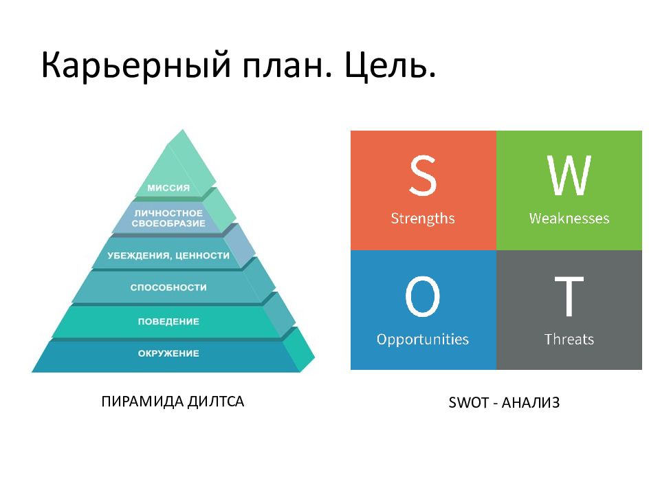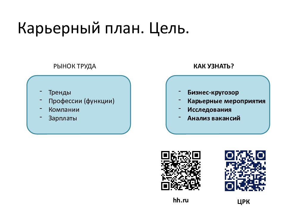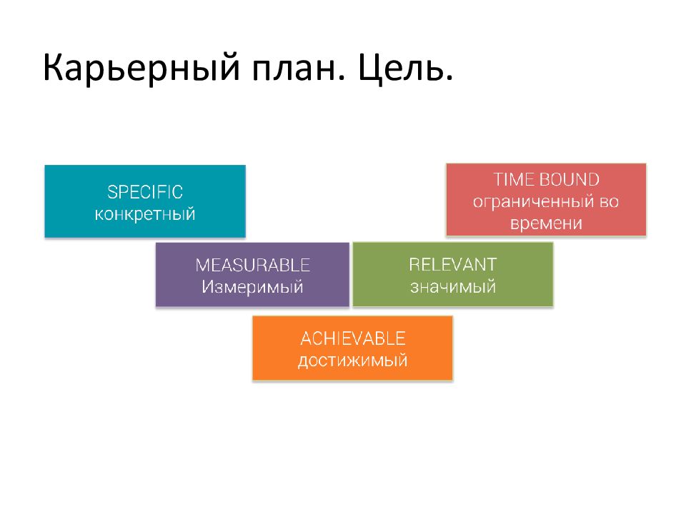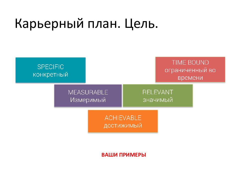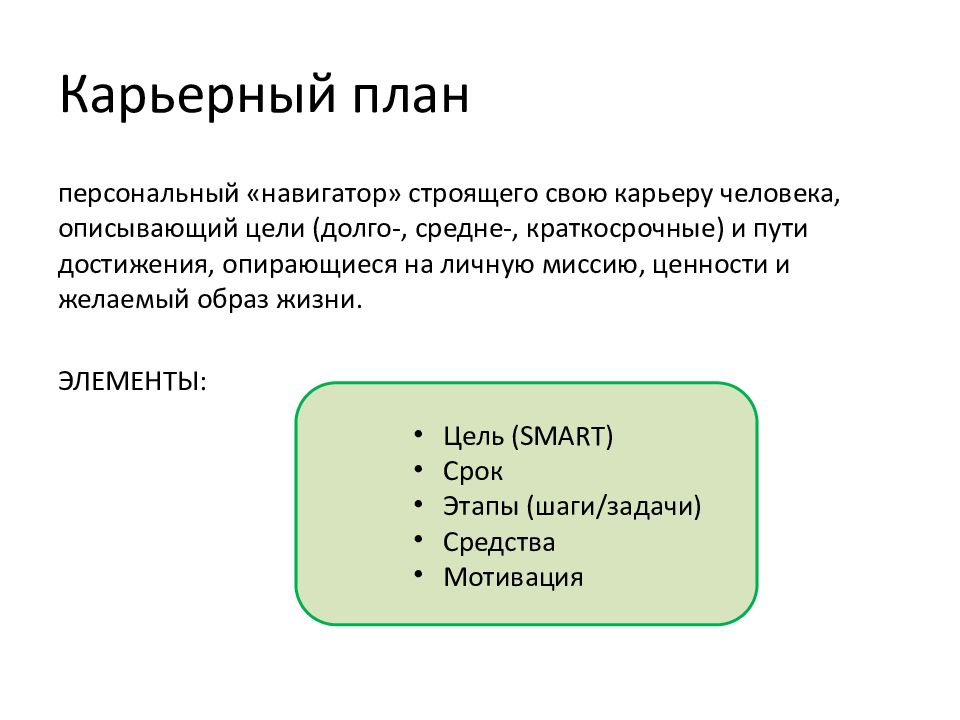 персональный «навигатор» строящего свою карьеру человека, описывающий цели (долго-, средне-, краткосрочные) и пути достижения, опирающиеся на личную миссию, ценности и желаемый образ жизни. ЭЛЕМЕНТЫ: Цель ( SMART ) Срок Этапы (шаги/задачи) Средства Мотивация Карьерный план