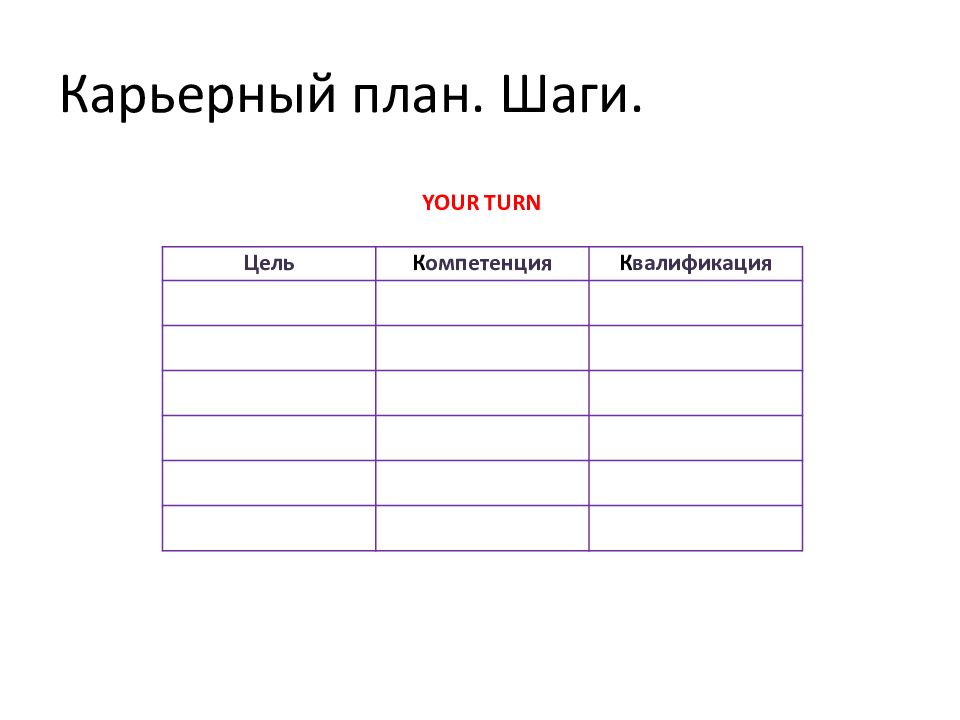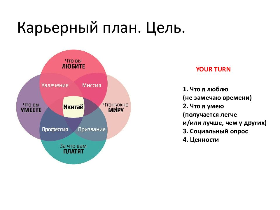 YOUR TURN 1. Что я люблю (не замечаю времени) 2. Что я умею (получается легче и/или лучше, чем у других) 3. Социальный опрос 4. Ценности