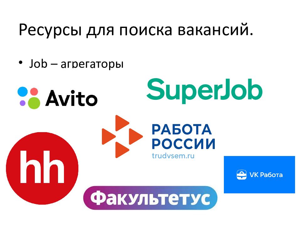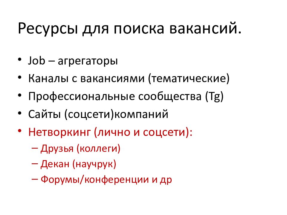 Job – агрегаторы Каналы с вакансиями (тематические) Профессиональные сообщества ( Tg ) Сайты ( соцсети )компаний Нетворкинг (лично и соцсети ): Друзья (коллеги) Декан ( научрук ) Форумы/конференции и др