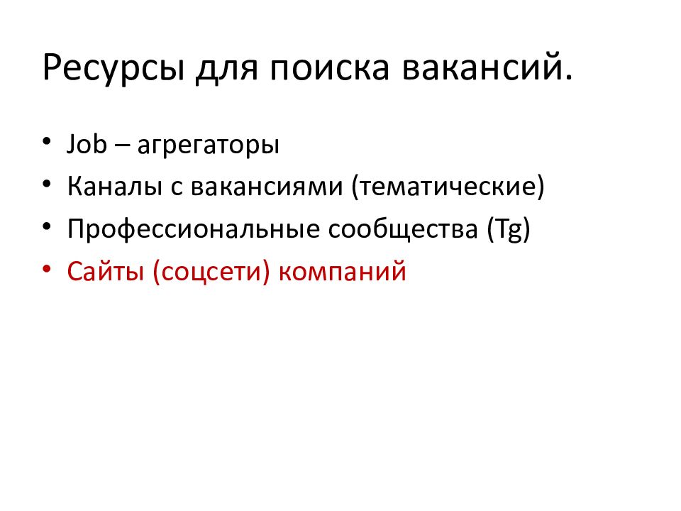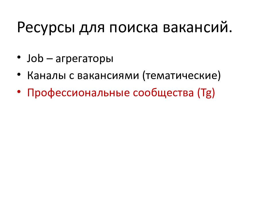 Job – агрегаторы Каналы с вакансиями (тематические) Профессиональные сообщества ( Tg ) Сайты ( соцсети ) компаний
