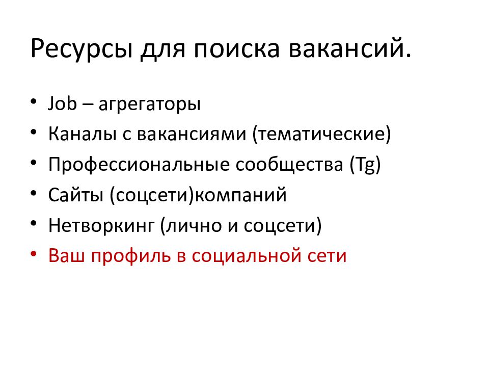 Job – агрегаторы Каналы с вакансиями (тематические) Профессиональные сообщества ( Tg ) Сайты ( соцсети )компаний Нетворкинг (лично и соцсети ) Ваш профиль в социальной сети