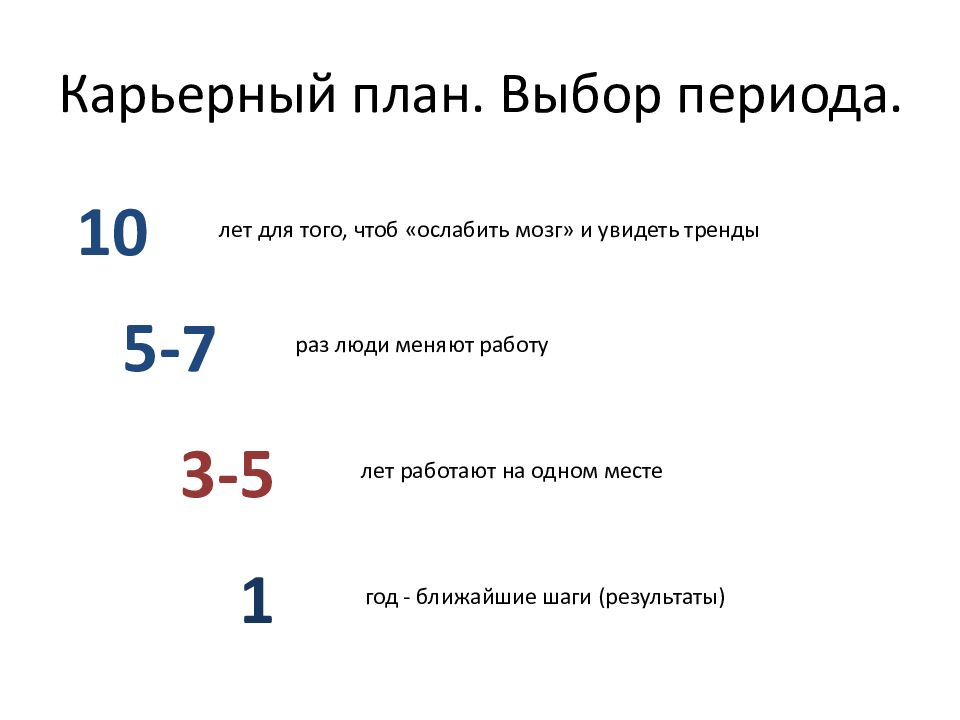 10 лет для того, чтоб «ослабить мозг» и увидеть тренды 5-7 раз люди меняют работу 3-5 лет работают на одном месте 1 год - ближайшие шаги (результаты)