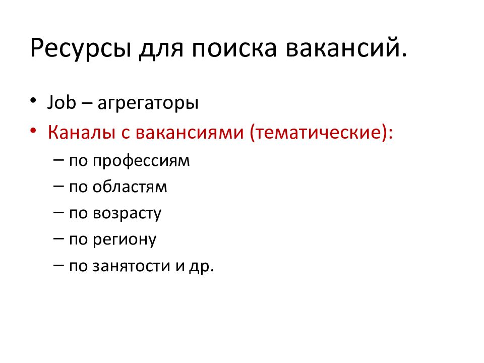Job – агрегаторы Каналы с вакансиями (тематические): по профессиям по областям по возрасту по региону по занятости и др.