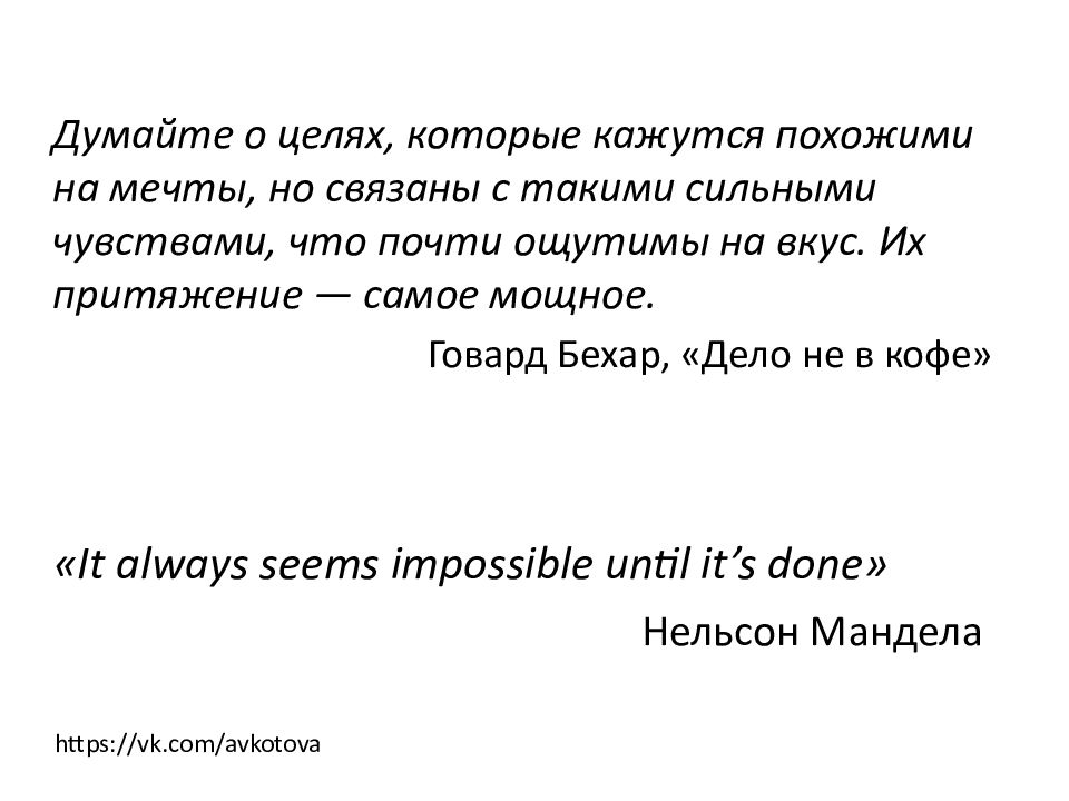 « It always seems impossible until it’s done » Нельсон Мандела Думайте о целях, которые кажутся похожими на мечты, но связаны с такими сильными чувствами, что почти ощутимы на вкус. Их притяжение — самое мощное. Говард Бехар, «Дело не в кофе» https://vk.com/avkotova