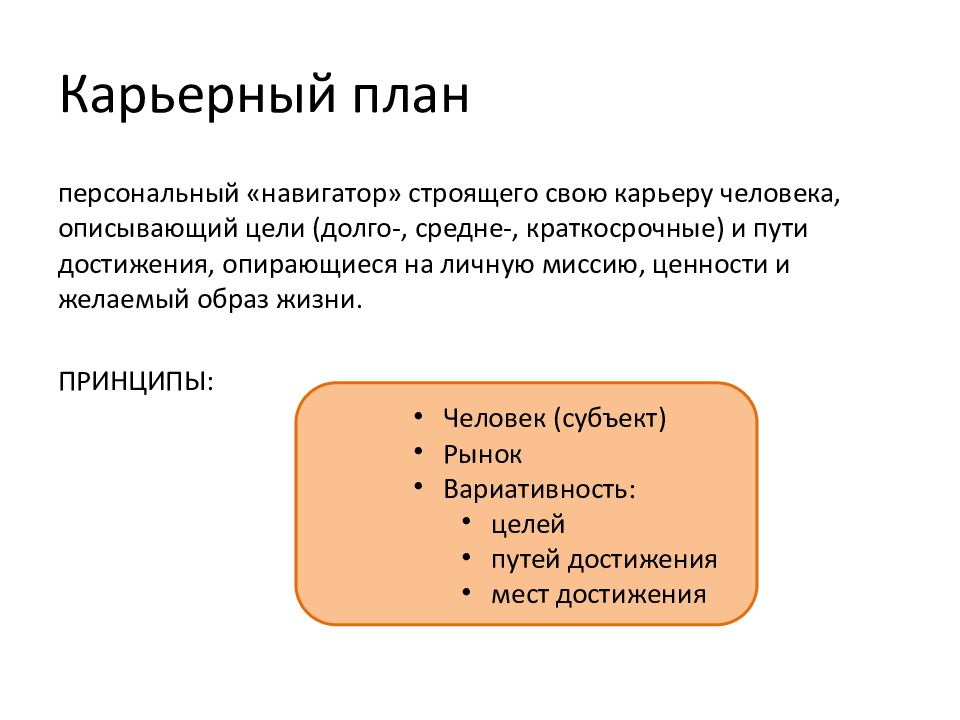 персональный «навигатор» строящего свою карьеру человека, описывающий цели (долго-, средне-, краткосрочные) и пути достижения, опирающиеся на личную миссию, ценности и желаемый образ жизни. ПРИНЦИПЫ: Человек (субъект) Рынок Вариативность: целей путей достижения мест достижения Карьерный план