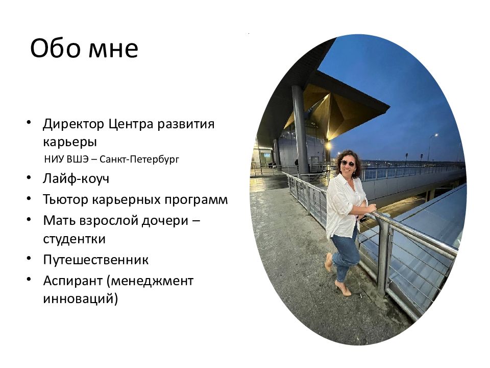 Директор Центра развития карьеры НИУ ВШЭ – Санкт-Петербург Лайф-коуч Тьютор карьерных программ Мать взрослой дочери – студентки Путешественник Аспирант (менеджмент инноваций)