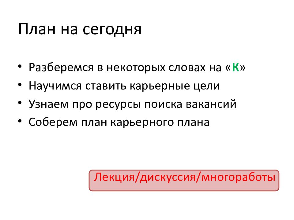 Разберемся в некоторых словах на « К » Научимся ставить карьерные цели Узнаем про ресурсы поиска вакансий Соберем план карьерного плана Лекция/дискуссия/ многоработы План на сегодня