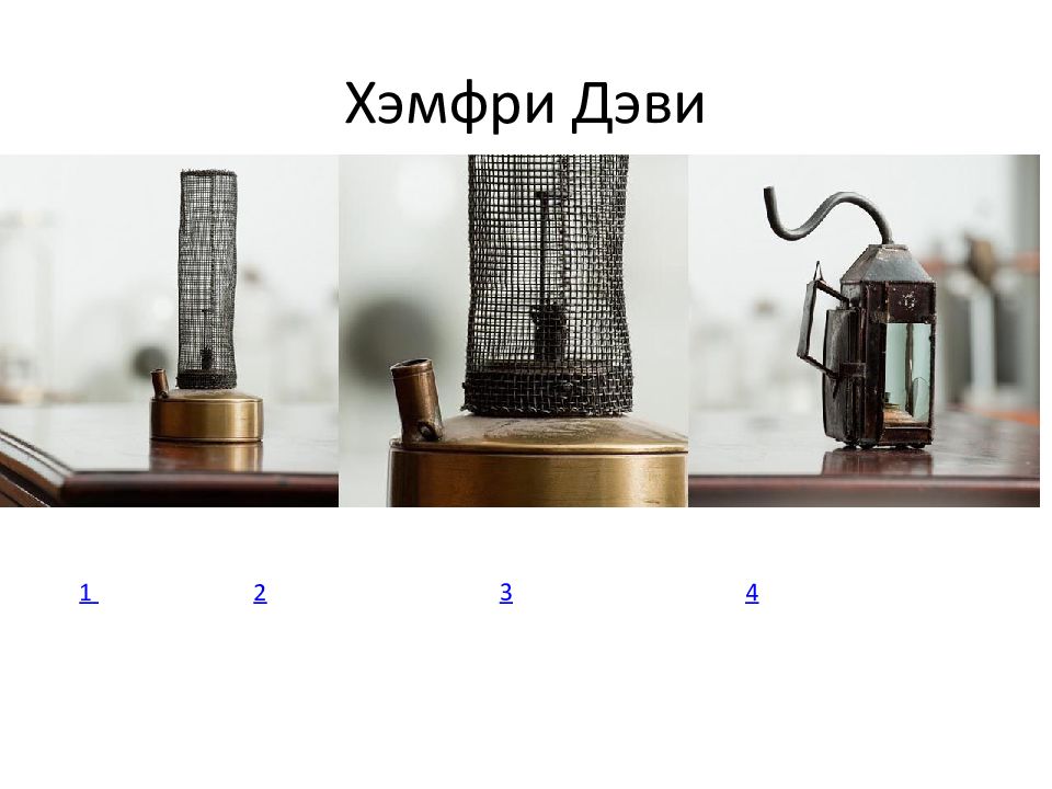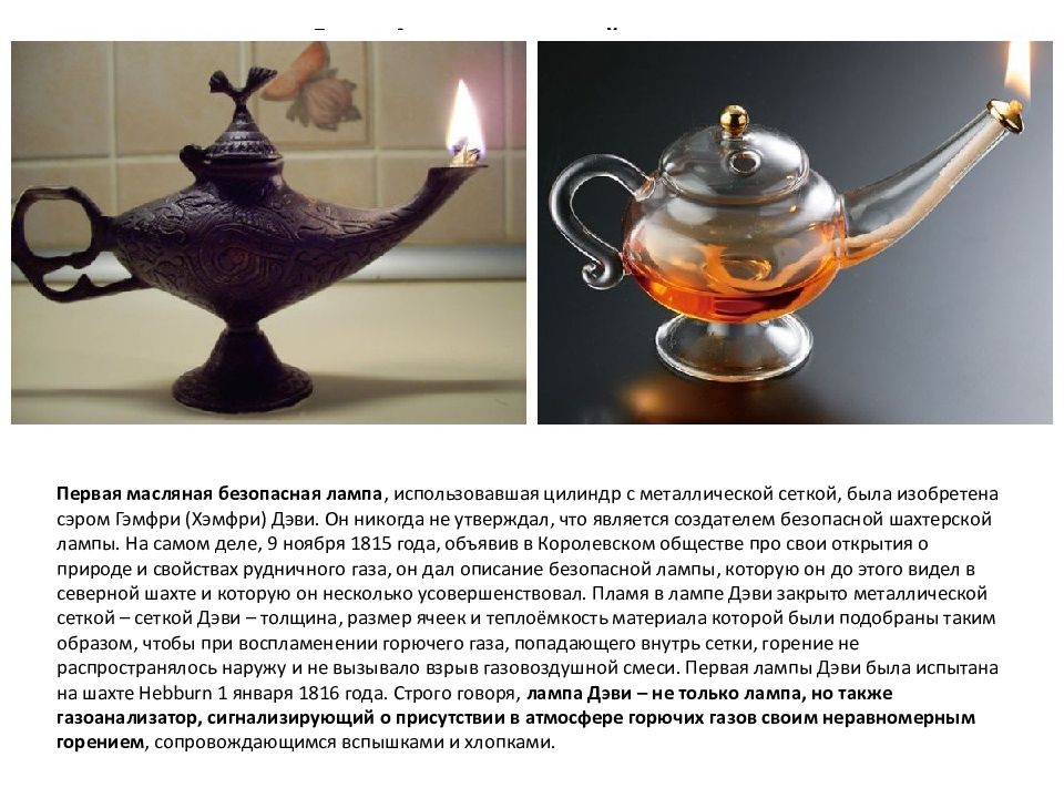 Лампа Аладдина – ночной светильник Первая масляная безопасная лампа, использовавшая цилиндр с металлической сеткой, была изобретена сэром Гэмфри ( Хэмфри ) Дэви. Он никогда не утверждал, что является создателем безопасной шахтерской лампы. На самом деле, 9 ноября 1815 года, объявив в Королевском обществе про свои открытия о природе и свойствах рудничного газа, он дал описание безопасной лампы, которую он до этого видел в северной шахте и которую он несколько усовершенствовал. Пламя в лампе Дэви закрыто металлической сеткой – сеткой Дэви – толщина, размер ячеек и теплоёмкость материала которой были подобраны таким образом, чтобы при воспламенении горючего газа, попадающего внутрь сетки, горение не распространялось наружу и не вызывало взрыв газовоздушной смеси. Первая лампы Дэви была испытана на шахте Hebburn 1 января 1816 года. Строго говоря, лампа Дэви – не только лампа, но также газоанализатор, сигнализирующий о присутствии в атмосфере горючих газов своим неравномерным горением, сопровождающимся вспышками и хлопками.