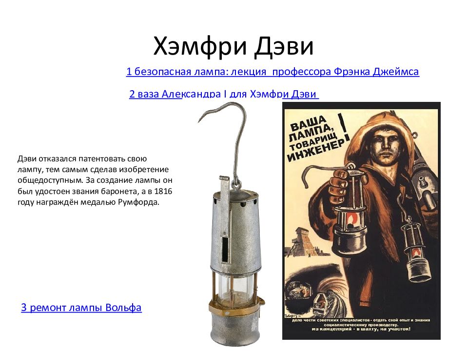 1 безопасная лампа: лекция профессора Фрэнка Джеймса 2 ваза Александра I для Хэмфри Дэви 3 ремонт лампы Вольфа Дэви отказался патентовать свою лампу, тем самым сделав изобретение общедоступным. За создание лампы он был удостоен звания баронета, а в 1816 году награждён медалью Румфорда.