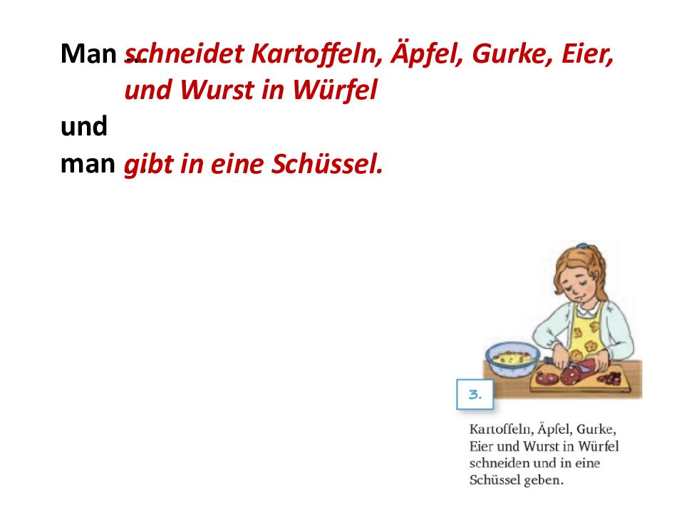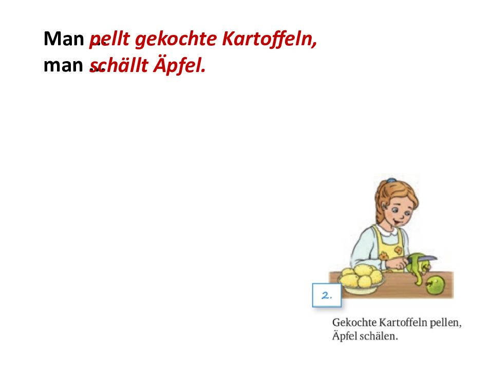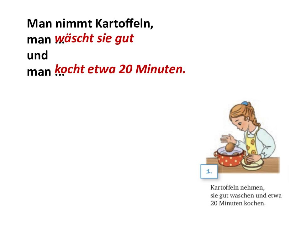 Man nimmt Kartoffeln, man... und man... wäscht sie gut kocht etwa 20 Minuten.