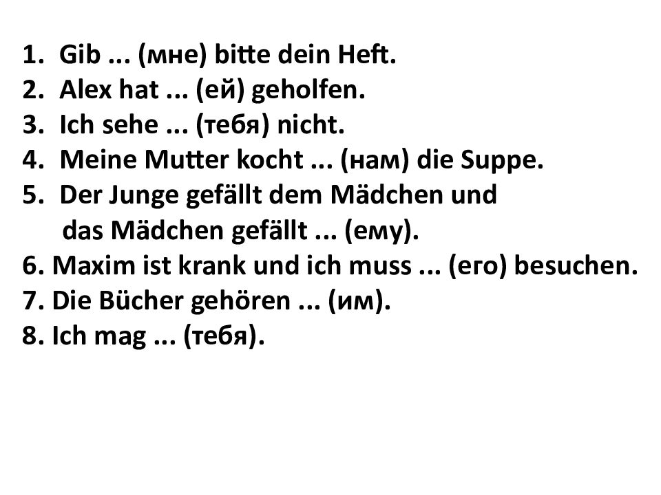 Gib... ( мне ) bitte dein Heft. Alex hat... ( ей ) geholfen. Ich sehe... ( тебя ) nicht. Meine Mutter kocht... ( нам ) die Suppe. Der Junge gefällt dem Mädchen und das Mädchen gefällt... ( ему ). 6. Maxim ist krank und ich muss... ( его ) besuchen. 7. Die Bücher gehören... ( им ). 8. Ich mag... ( тебя ).