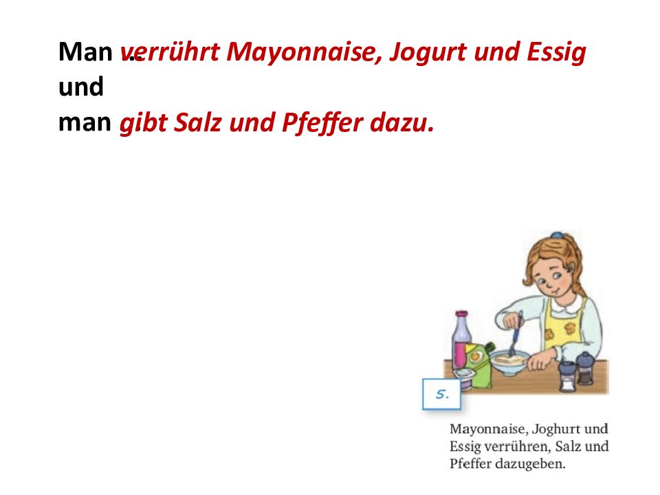 Man... und man... verrührt Mayonnaise, Jogurt und Essig gibt Salz und Pfeffer dazu.