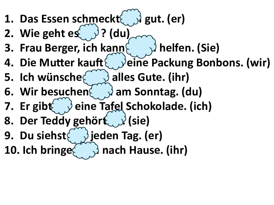 Das Essen schmeckt ihm gut. (er) Wie geht es dir ? (du) Frau Berger, ich kann ihnen helfen. (Sie) Die Mutter kauft uns eine Packung Bonbons. (wir) Ich wünsche euch alles Gute. (ihr) Wir besuchen dich am Sonntag. (du) Er gibt mir eine Tafel Schokolade. (ich) Der Teddy gehört ihr. (sie) Du siehst ihn jeden Tag. (er) Ich bringe euch nach Hause. (ihr)
