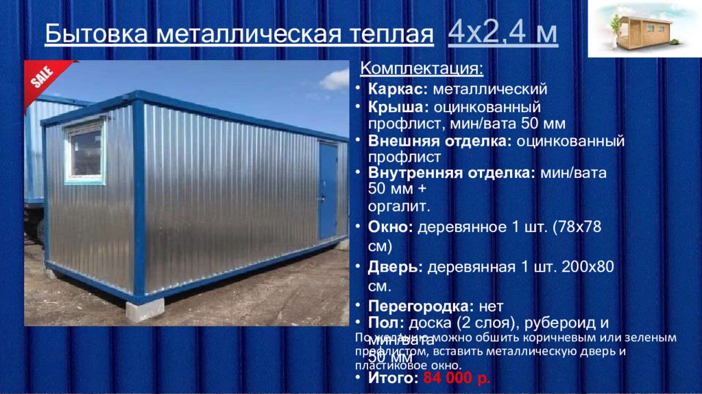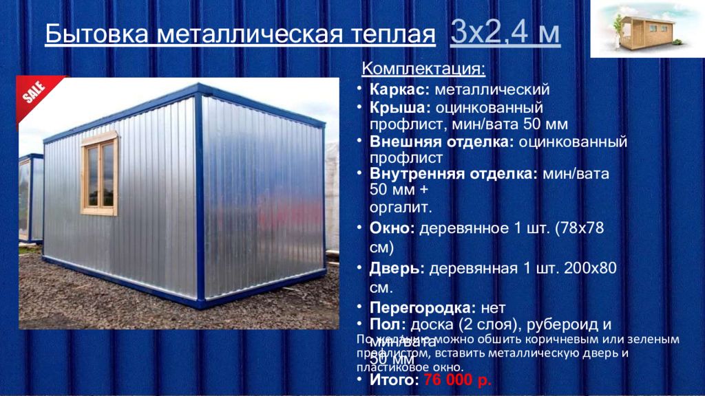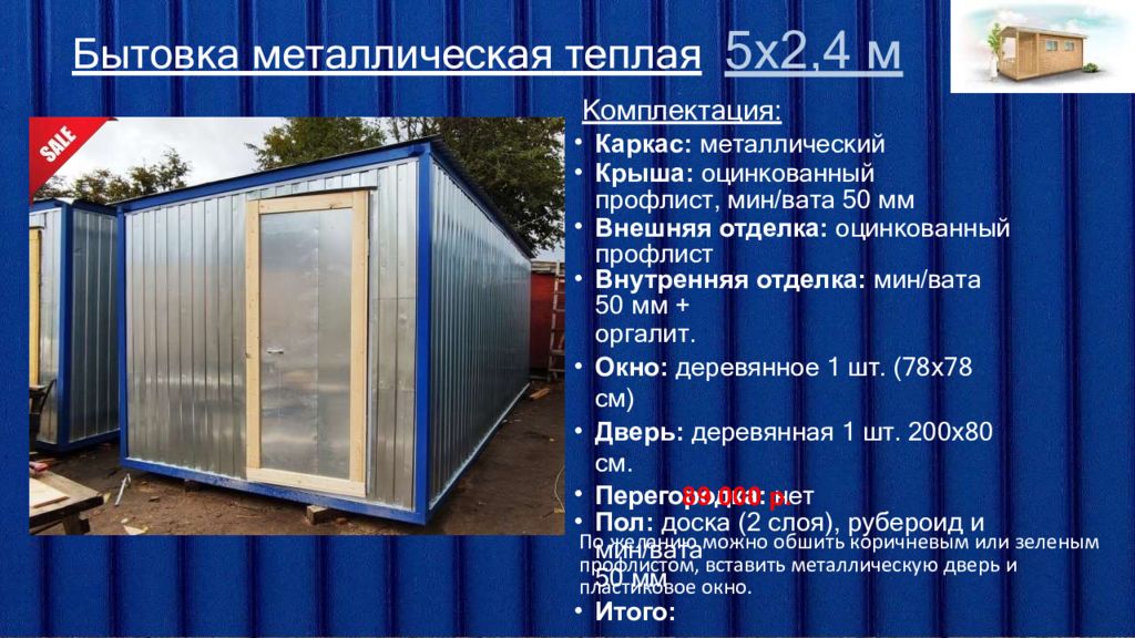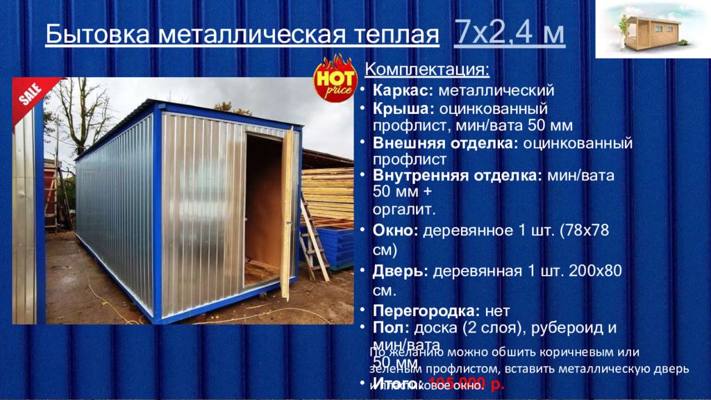 Комплектация: Каркас: металлический Крыша: оцинкованный профлист, мин/вата 50 мм Внешняя отделка: оцинкованный профлист Внутренняя отделка: мин/вата 50 мм + оргалит. Окно: деревянное 1 шт. (78х78 см) Дверь: деревянная 1 шт. 200х80 см. Перегородка: нет Пол: доска (2 слоя), рубероид и мин/вата 50 мм Итого : 105 000 р. По желанию можно обшить коричневым или зеленым профлистом, вставить металлическую дверь и пластиковое окно.