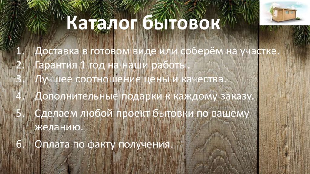 Доставка в готовом виде или соберём на участке. Гарантия 1 год на наши работы. Лучшее соотношение цены и качества. Дополнительные подарки к каждому заказу. Сделаем любой проект бытовки по вашему желанию. Оплата по факту получения.