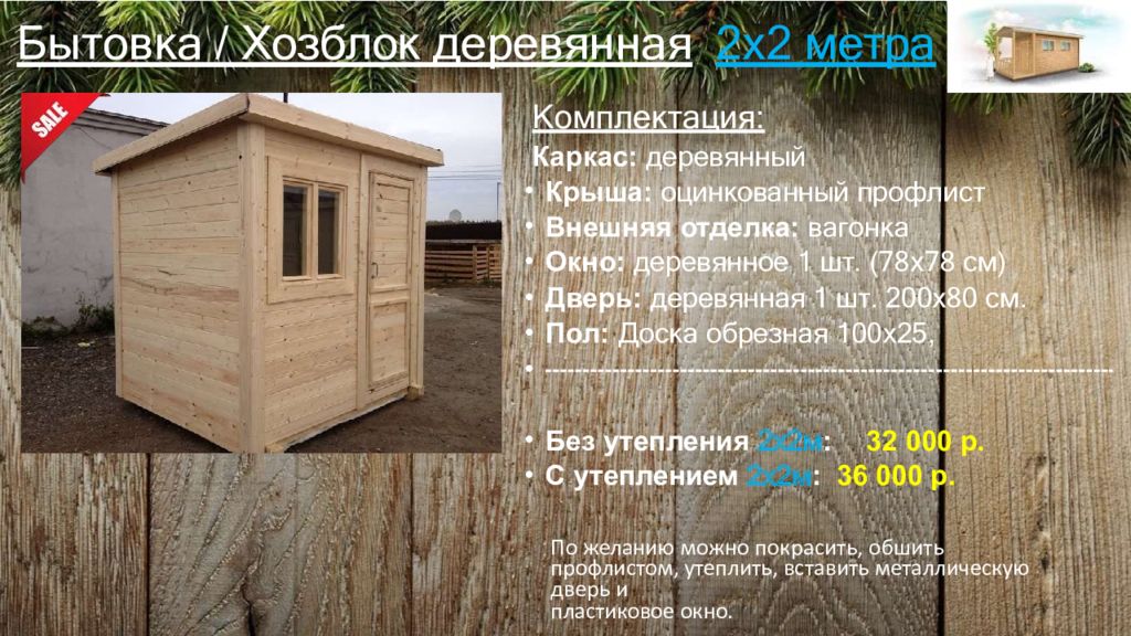 Комплектация: Каркас: деревянный Крыша: оцинкованный профлист Внешняя отделка: вагонка Окно: деревянное 1 шт. (78х78 см) Дверь: деревянная 1 шт. 200х80 см. Пол: Доска обрезная 100х25, • Без утепления 4х2,1м : 46 000 р. С утеплением 4х2,3м : 5 2 000 р. По желанию можно покрасить, обшить профлистом, утеплить, вставить металлическую дверь и пластиковое окно.