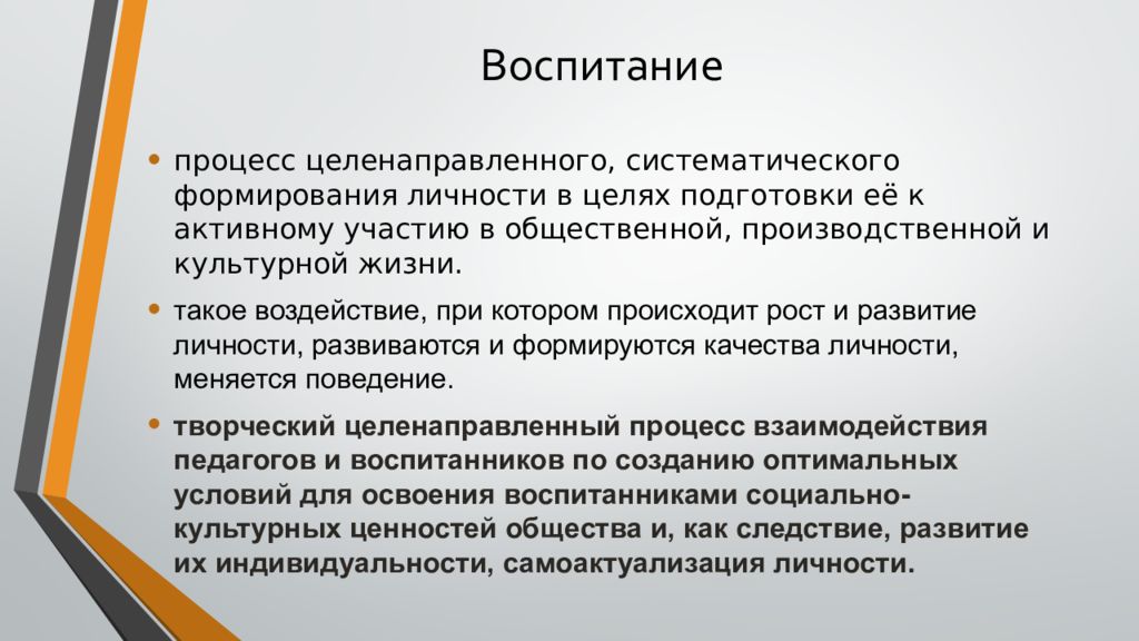 процесс целенаправленного, систематического формирования личности в целях подготовки её к активному участию в общественной, производственной и культурной жизни. такое воздействие, при котором происходит рост и развитие личности, развиваются и формируются качества личности, меняется поведение. творческий целенаправленный процесс взаимодействия педагогов и воспитанников по созданию оптимальных условий для освоения воспитанниками социально-культурных ценностей общества и, как следствие, развитие их индивидуальности, самоактуализация личности.