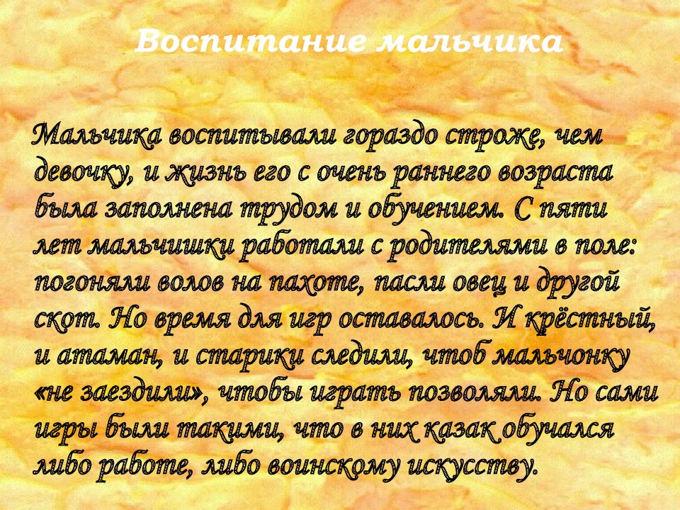Мальчика воспитывали гораздо строже, чем девочку, и жизнь его с очень раннего возраста была заполнена трудом и обучением. С пяти лет мальчишки работали с родителями в поле: погоняли волов на пахоте, пасли овец и другой скот. Но время для игр оставалось. И крёстный, и атаман, и старики следили, чтоб мальчонку «не заездили», чтобы играть позволяли. Но сами игры были такими, что в них казак обучался либо работе, либо воинскому искусству. Воспитание мальчика