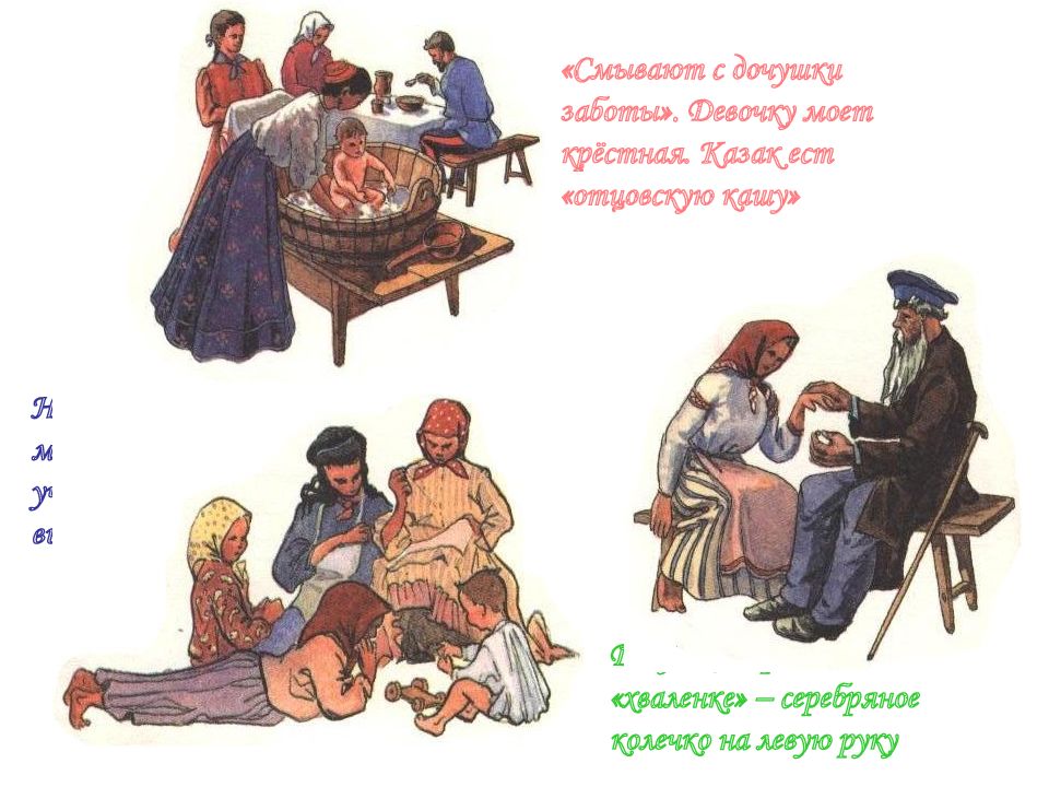 «Смывают с дочушки заботы». Девочку моет крёстная. Казак ест «отцовскую кашу» Нянчат младших и учатся вышивать Дедушка дарит «хваленке» – серебряное колечко на левую руку