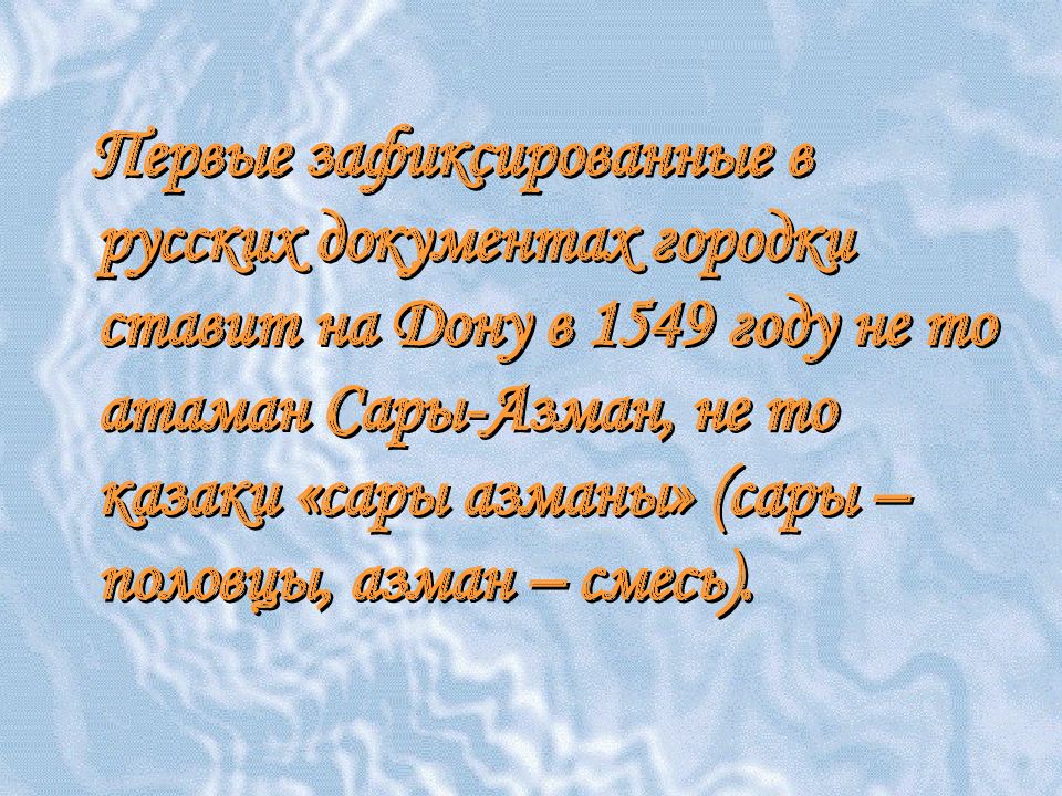 Первые зафиксированные в русских документах городки ставит на Дону в 1549 году не то атаман Сары-Азман, не то казаки «сары азманы» (сары – половцы, азман – смесь).