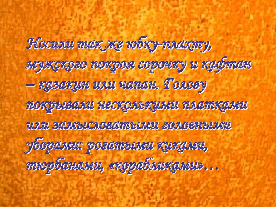 Носили так же юбку-плахту, мужского покроя сорочку и кафтан – казакин или чапан. Голову покрывали несколькими платками или замысловатыми головными уборами: рогатыми киками, тюрбанами, «корабликами»…