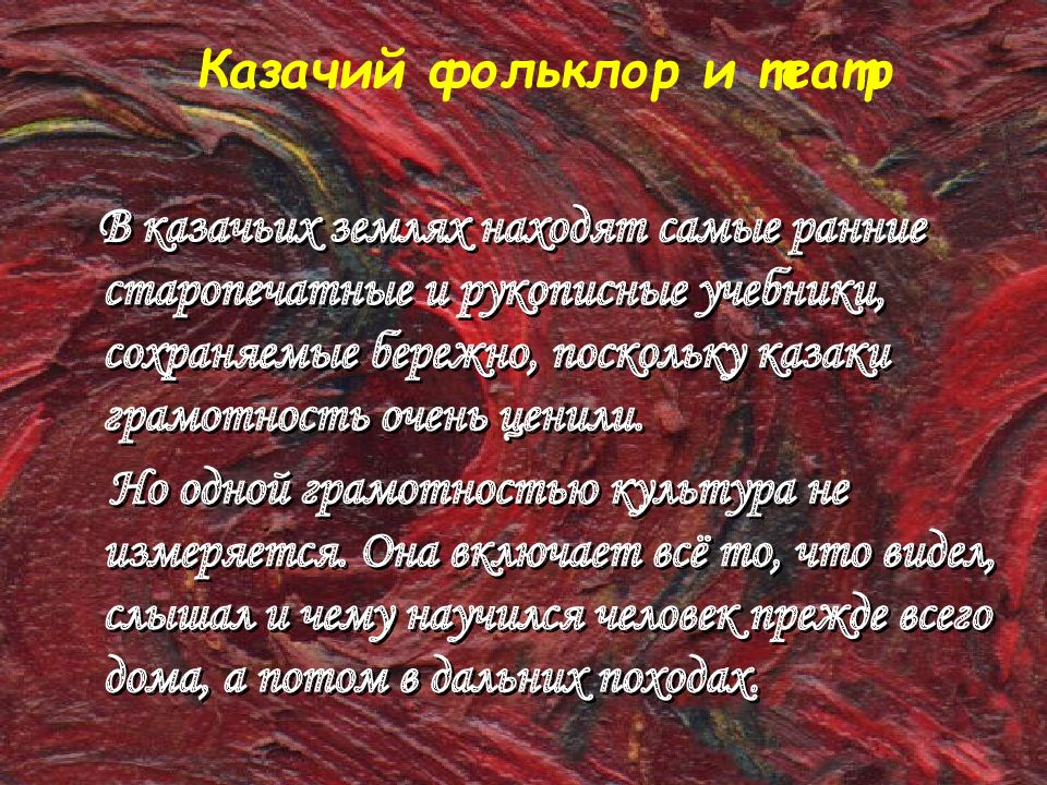 В казачьих землях находят самые ранние старопечатные и рукописные учебники, сохраняемые бережно, поскольку казаки грамотность очень ценили. Но одной грамотностью культура не измеряется. Она включает всё то, что видел, слышал и чему научился человек прежде всего дома, а потом в дальних походах. Казачий фольклор и театр